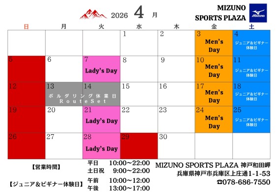 4月13日(月)14日(火)はルートセット日の為休業日となっております。