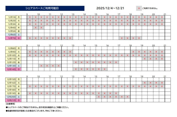 シェアスペース空き状況【12月4日(木)~12月21日(日)まで】