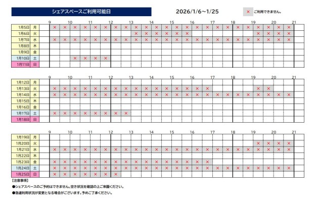 シェアスペース空き状況【1月6日(火)~1月25日(日)まで】