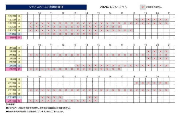 シェアスペース空き状況【1月26日(月)~2月15日(日)まで】