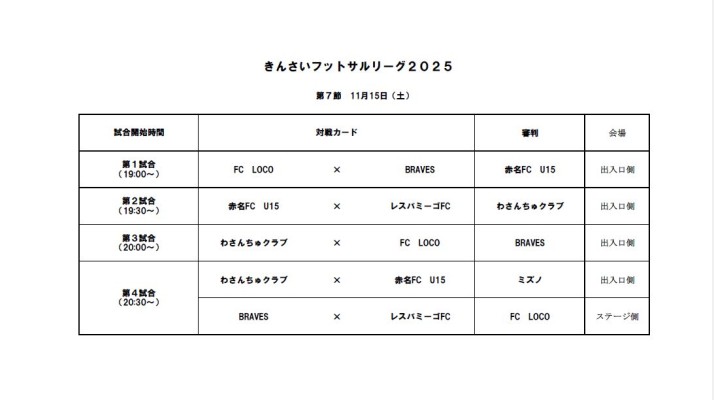 【きんさいフットサルリーグ2025】11月15日(土)スケジュールNEW!