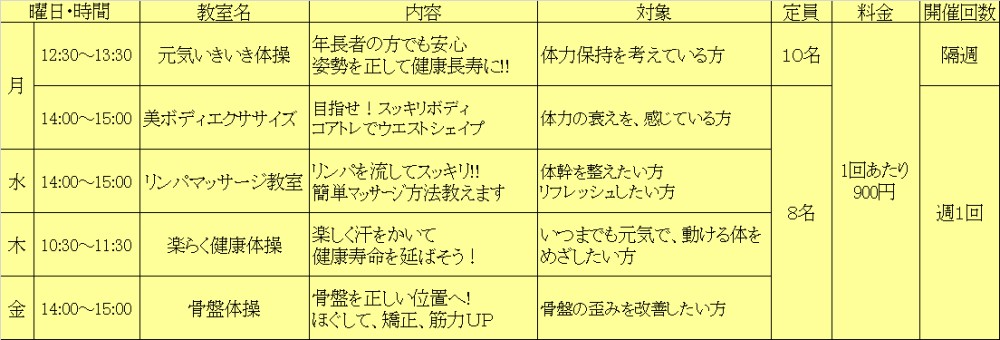※施設の予定や講師の都合により、開催日数が月別で異なる場合がございます。