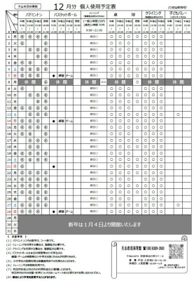 年末年始12月29日(月)~1月3日(土)まで全館休館です。