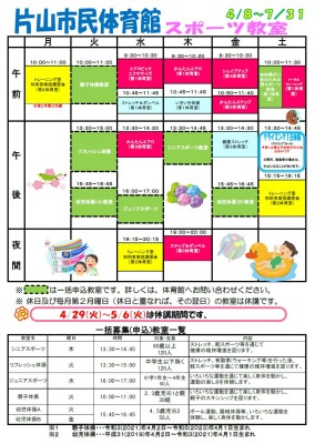 1日スポーツ教室 4月~7月 予定表