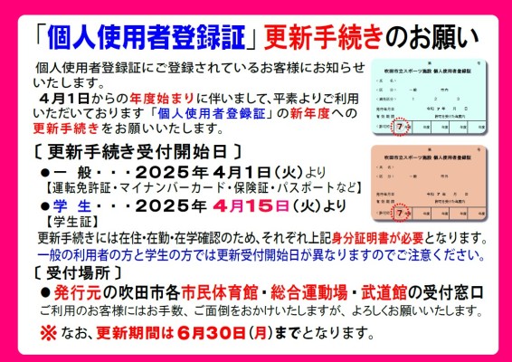 発行元の吹田市各市民体育館、総合運動場、武道館にて更新手続きお願いいたします。