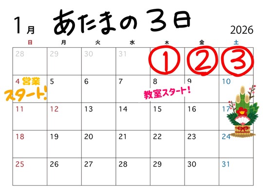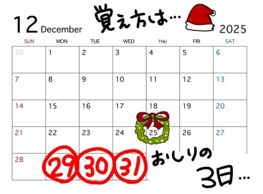 年末は12月29日(月)から1月3日(土)までお休みです。
