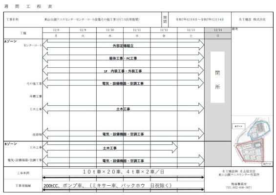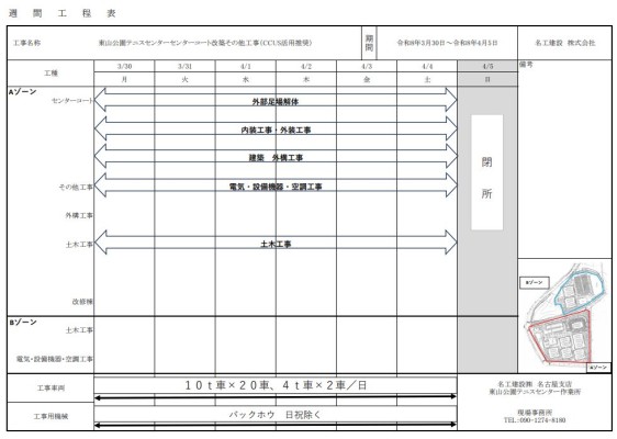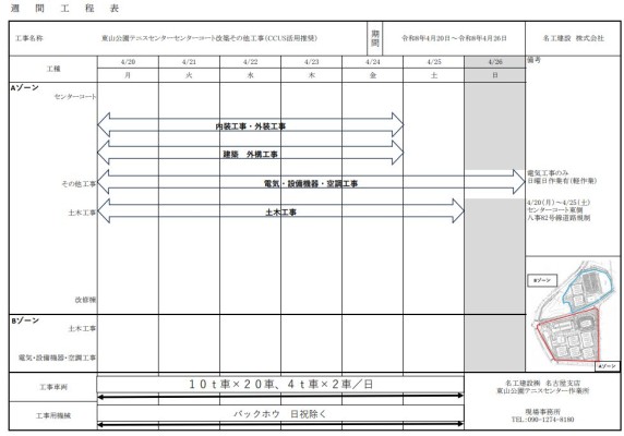 東山公園テニスセンター改修工事の週間工程表をお知らせいたします。