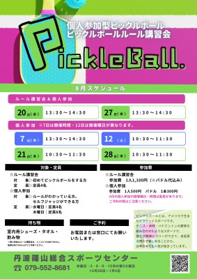 8月のピックルボールルール講習会・個人参加の開催日をお知らせいたします。