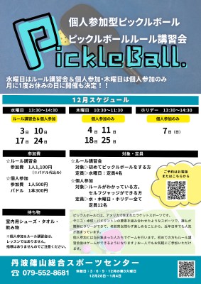 12月のピックルボールルール講習会・個人参加の開催日をお知らせいたします。
