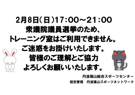 2月8日(日)17:00~21:00は衆議院議員選挙開票場となるため、