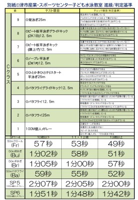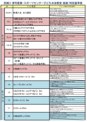 市産業・スポーツセンター子ども水泳教室 進級、判定基準表