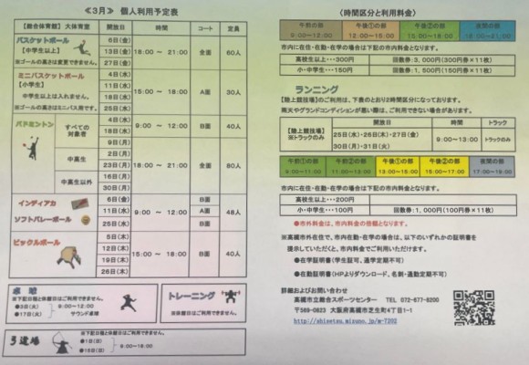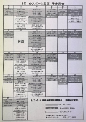 2月・3月のスポーツ教室予定表です。