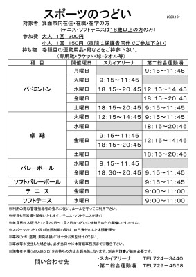 持ち物:各種目の運動用品・服などをご持参ください(専用靴・ラケット・球・タオルなど)