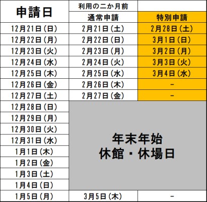 それに伴い、休業日の分の施設予約が可能になる日程につきまして、事前に予約受付を開始させていただきます。(特別申請)