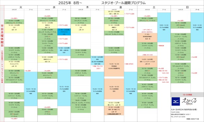 8月~のスタジオ・プール週間プログラムを配信させていただきます。