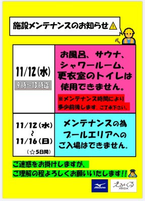 【11/12(水)~11/16(日)施設メンテナンスに関してのお知らせ】