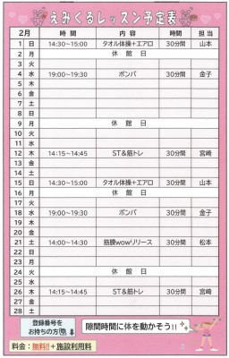 【2月えみくるレッスン予定表】を配信させていただきます!