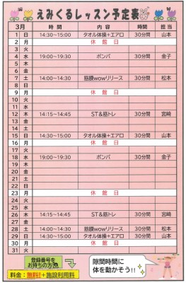 【3月えみくるレッスン予定表】のお知らせ