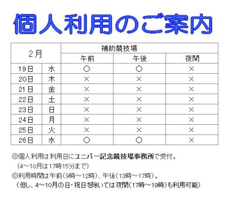 ユニバー記念競技場内、1階 事務所横券売機で 利用券を購入いただき 券売機横の受付へ進み 個人利用申請を行なってください。