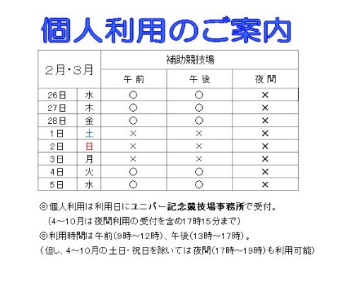 ユニバー記念競技場内、1階 事務所横券売機で 利用券を購入いただき 券売機横の受付へ進み 個人利用申請を行なってください。