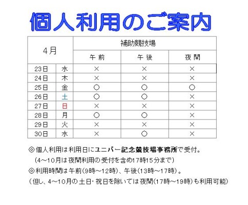 ユニバー記念競技場内、1階 事務所横券売機で 利用券を購入いただき 券売機横の受付へ進み 個人利用申請を行なってください。