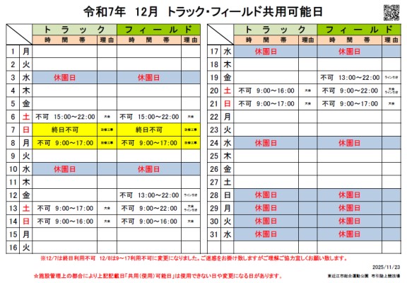 【11/23更新】12月トラック・フィールド利用可能日時のお知らせ