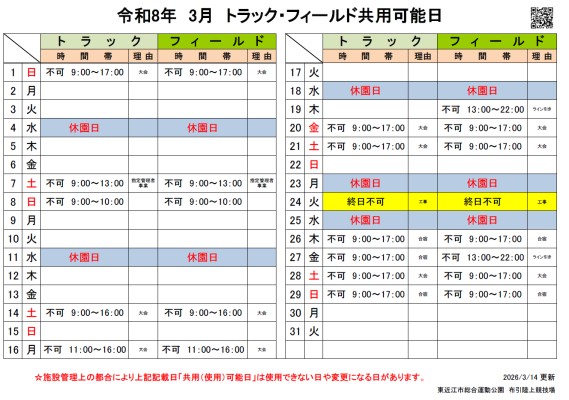 ※3/14更新 26年3月度トラック&フィールド利用可能日時のお知らせ