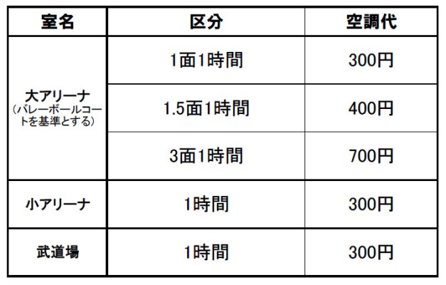 この度、改修工事にて新調された、大アリーナ・小アリーナ・武道場の空調設備の使用料金についてお知らせいたします。