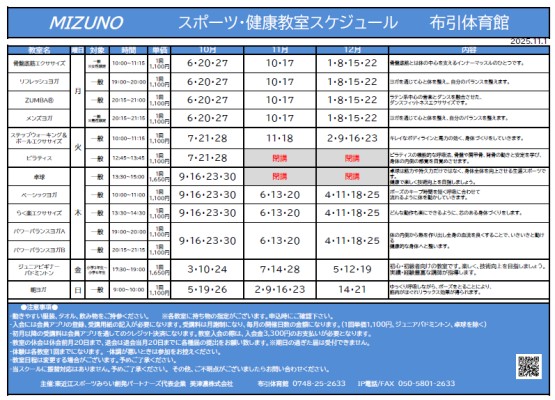 ※11/1更新【教室スケジュール】布引体育館教室スケジュールのお知らせ(25年10~12月度)