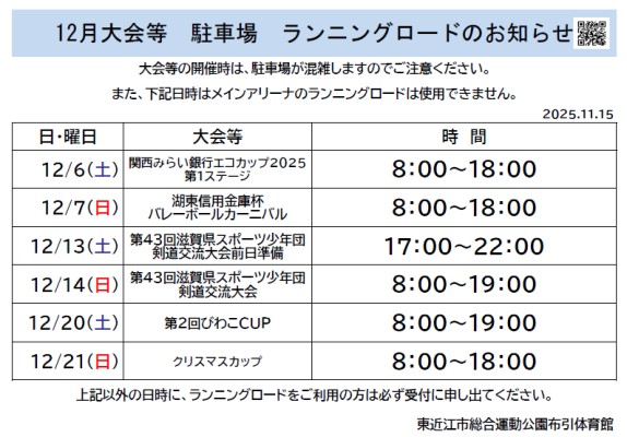 【12月度】大会・駐車場混雑・ランニングロード利用不可日時のお知らせ