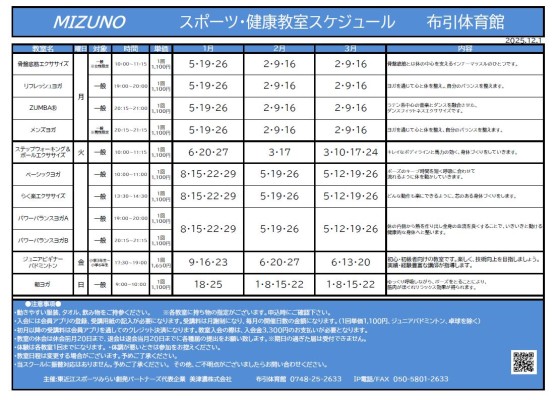 1・2・3月度の布引体育館教室スケジュールをお知らせいたします。