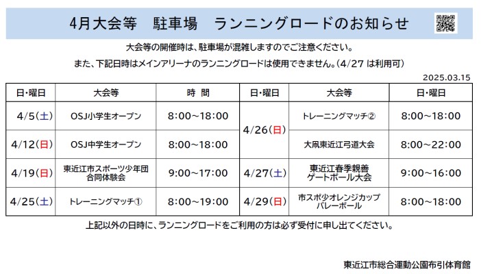4月度の体育館大会情報・駐車場混雑予想・ランニングロード利用不可日時をお知らせいたします。