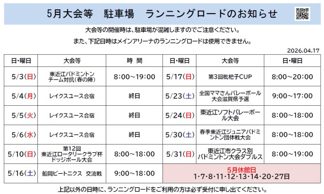 5月度の体育館大会情報・駐車場混雑予想・ランニングロード利用不可日時をお知らせいたします。