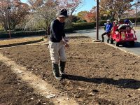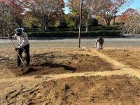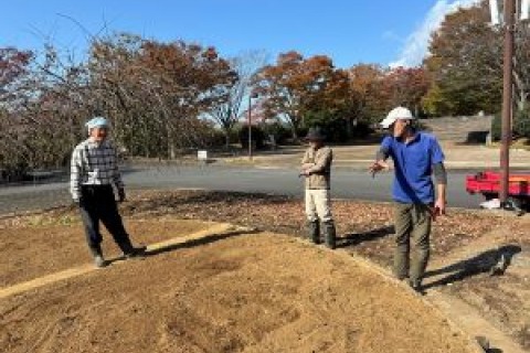 いいお天気の暖かい中、バスロータリーの花壇にネモフィラの種を撒いて