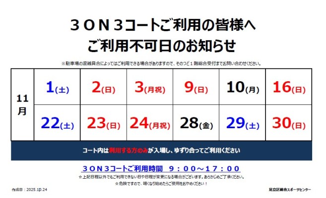 2025年11月の3ON3コートご利用不可日は下記日程となります。