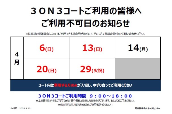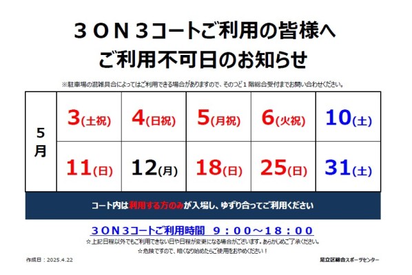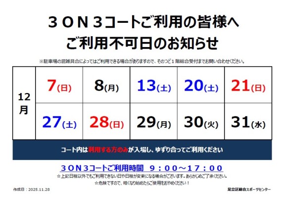 2025年12月の3ON3コートご利用不可日は下記日程となります。
