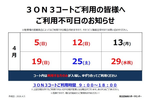 2026年4月の3ON3コートご利用不可日は下記日程となります。