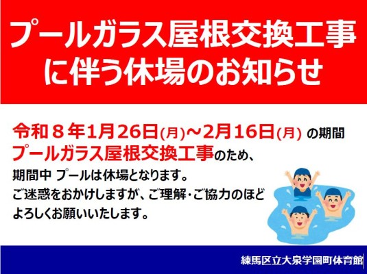 令和8年1月26日(月)∼2月16日(月) の期間プールガラス屋根交換工事のため、 期間中 プールは休場となります。 ご迷惑をおかけしますが、ご理解・ご協力のほど よろしくお願いいたします。