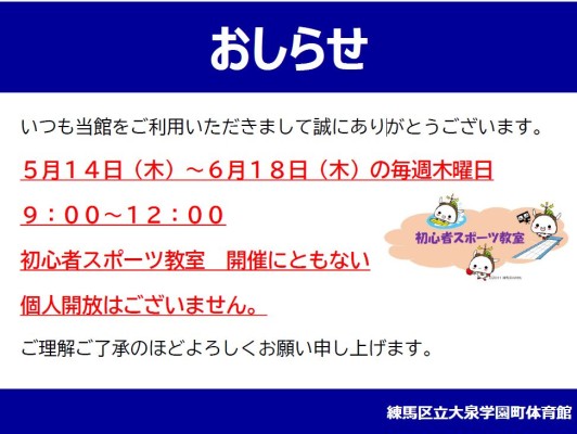 【大泉学園町体育館】5月14日(木)~6月18日(木)木曜日 個人開放中止のおしらせ