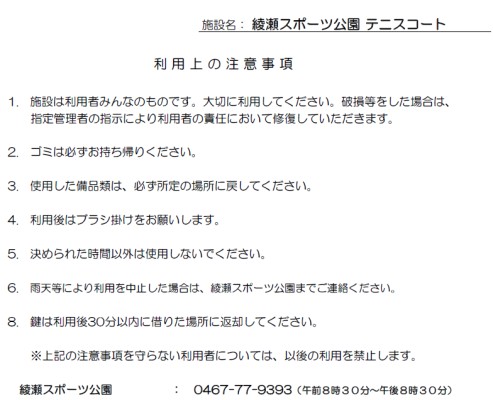 スポーツ公園テニスコート利用上の注意事項