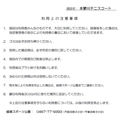 本蓼川テニスコートの注意事項についてお知らせいたします