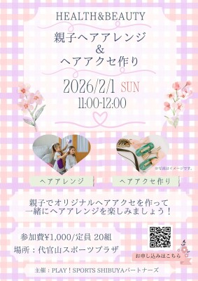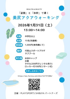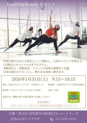 日程:2026年1月31日(土)9:15~10:15 会場:代官山スポーツプラザ 多目的ルーム 参加費:1,000円(サブスク会員は無料) 持参物:ヨガマット(貸し出しあり) 応募方法:開催日時に直接会場までお越しください![]()