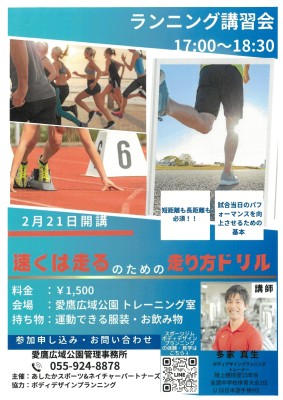 ランニング講習会では長距離を走るときに必要な【効率の良い走り】を目指して『足の設置』や『心肺機能について』、さらには『体幹』や『食事について』もスポーツトレーナー兼陸上競技現役の選手がお教えします!