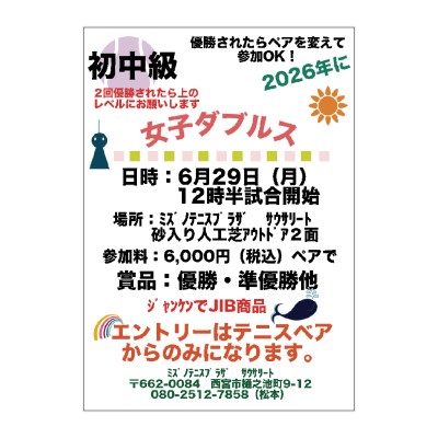 2026年6月29日(月)女子ダブルス初中級 (大会)