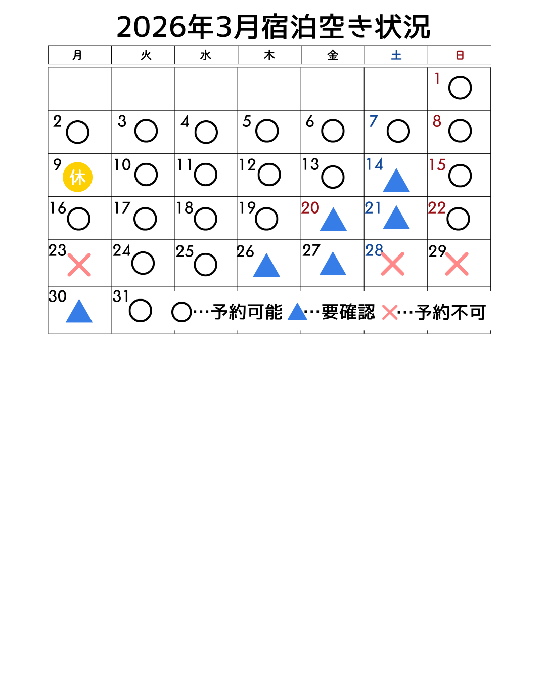 ・ご予約の際は、お電話にてお問い合わせください ※×…キャンセル待ち可能