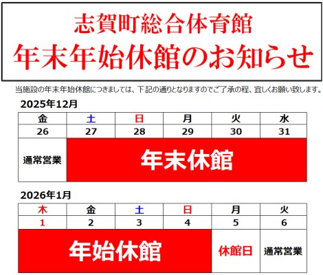 今年度の年末年始休館日は下記の通りになります。
