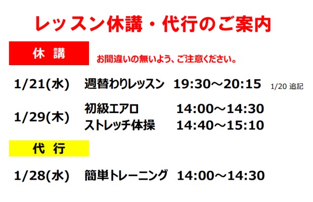 下記日程のレッスンは大雪予報及び講師都合の為、休講とさせていただきます。