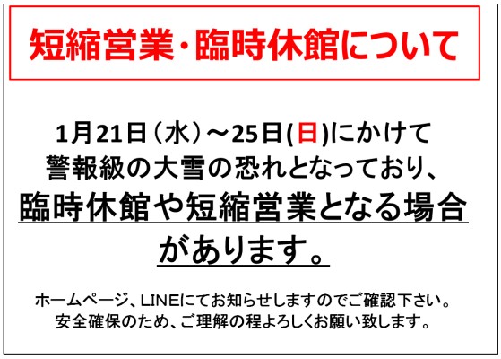 日頃より、当施設をご利用いただきありがとうございます。 1月20日(火)より大雪予報となり、営業時間の短縮や臨時休館の可能性があります。 ご利用の際は、HPで最新の情報をご確認の上お越し下さい。