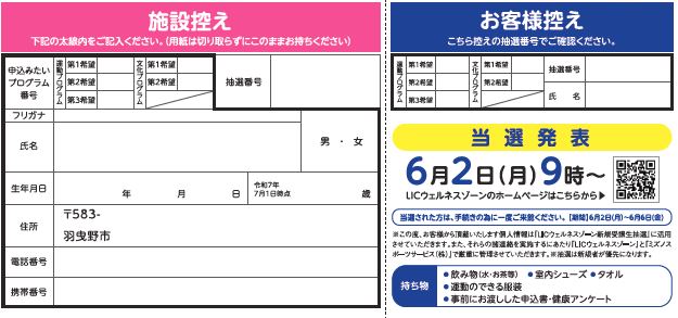■LICウェルネスゾーン入口横にて、当選番号を掲示いたします。市ウェブサイト・LICウェルネスゾーンHPでも掲載します。
