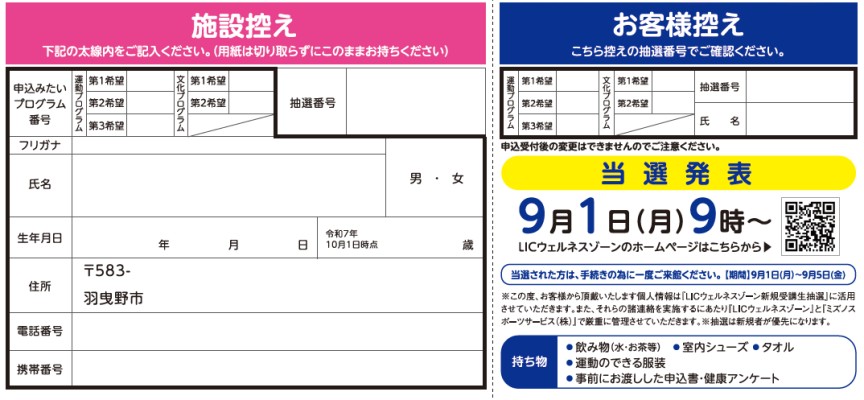 ■LICウェルネスゾーン入口横にて、当選番号を掲示いたします。市ウェブサイト・LICウェルネスゾーンHPでも掲載します。